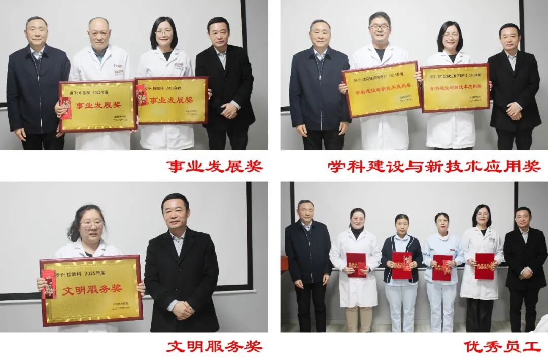 会议首先对2025年度在医院改革发展和服务群众过程中表现突出的先进集体和个人进行了集中表彰。大会分别颁发了事业发展奖、文明服务奖、学科建设与新技术应用奖以及2025年度优秀员工等荣誉。